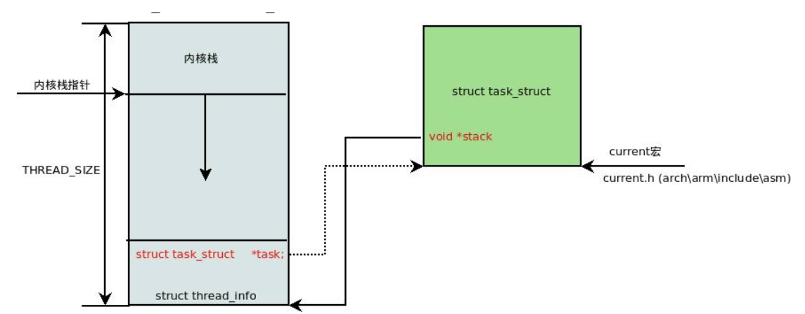 系统版本号。每个进程创建的时候,系统会为这个进程创建2个页大小的内核栈。这个内核栈底下是thread_info结构。高位是栈。