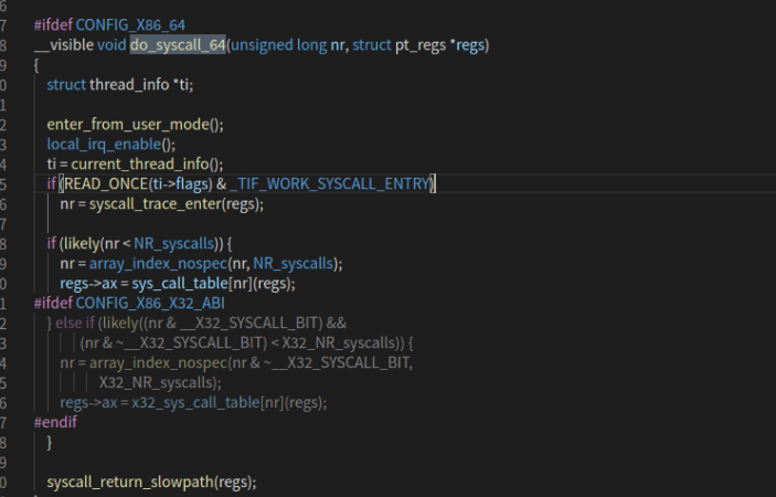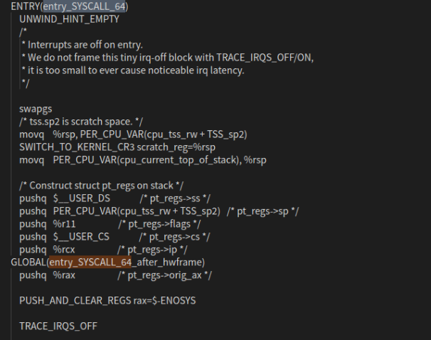 第一个特殊模块集寄存器- MSR_STAR 为用户代码的代码段。这些数据将加载至 CS 和 SS 段选择符,由提供将系统调用返回至相应特权级的用户代码功能的 sysret 指令使用。 第二行代码中将使用系统调用入口entry_SYSCALL_64 填充 MSR_LSTAR 寄存器。 entry_SYSCALL_64 在arch/x86/entry/syscall_64.S汇编文件中定义,包含系统调用执行前的准备。
