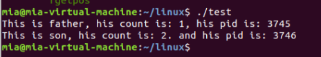 #include"stdio.h" int main() { int count = 1; int child; if(!(child = fork())) { //开始创建子进程 printf("This is son, his count is: %d. and his pid is: %d\n", ++count, getpid());//子进程的内容 } else { printf("This is father, his count is: %d, his pid is: %d\n", count, getpid()); } }