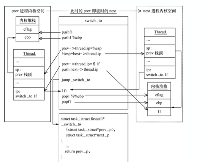 (3)switch_to利用了prev和next两个参数:prev指向当前进程,next指向被调度的进程