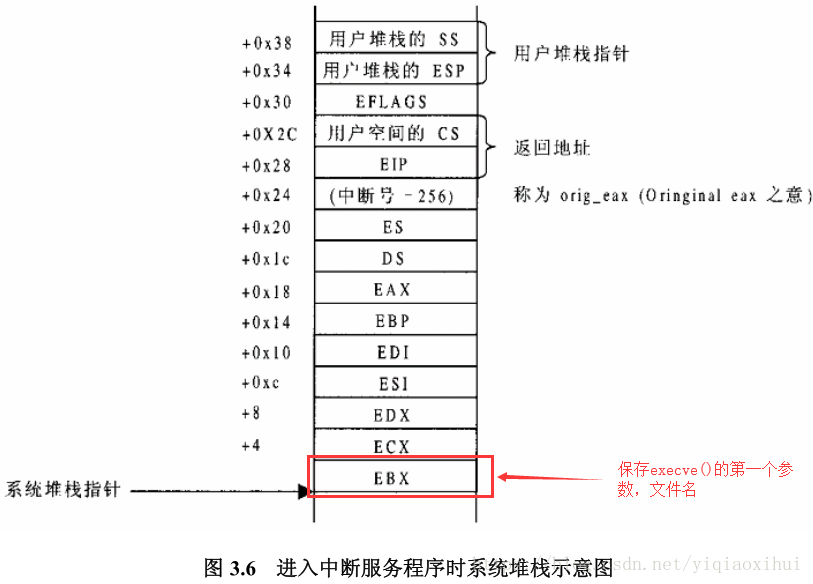 (2)发生中断——save cs:eip/esp/eflags(current) to kernel stack,then load cs:eip(entry of a specific ISR) and ss:esp(point to kernel stack).