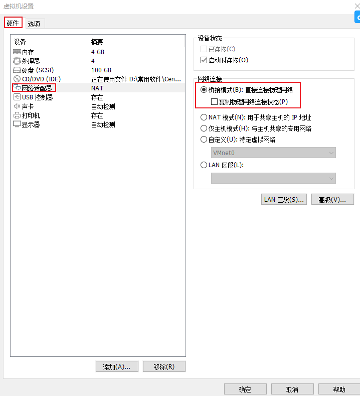 2.将硬件-》网络适配器-》网络连接模式改为桥接模式