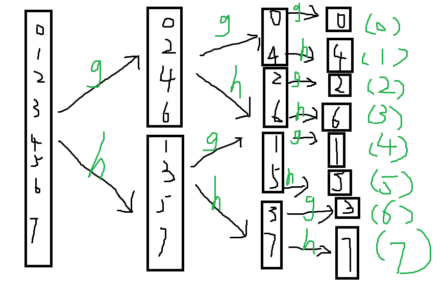 发现一个数会到其二进制反转后的那个数那里。考虑证明。 第一次分治时,分 \(g\) 还是分 \(h\) 是在为结果第一位做选择:分 \(g\) 第一位就是 \(0\),分 \(h\) 第一位就是 \(1\)。分哪里又是根据奇偶性决定的,也就是根据原数最后一位决定的,所以结果第一位就是原数最后一位。分完过后,坐标离散化实际上就是将其右移一位,然后又变成了子问题继续划分。所以归纳得证。
