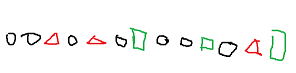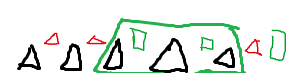 其中,红三角形代表这个值位于 \([a_1\sim a_{l-1}]\),绿方形代表这个值位于 \([a_l\sim a_r]\),黑圆圈代表这个值位于 \([a_{r+1}\sim a_n]\)。首先考虑黑圆圈,当它们被加入的时候,它们的连边方式不可能跨越绿点或红点(姑且这么称呼吧),因此可以发现,一段连续的黑圆圈可以构成一棵确定的子树,然后其根连在哪可能确定可能不确定。具体而言,如果说一段黑点位于两个红点间,那它的根必定是这两点间后加入那个的儿子。如果位于一个红点一个绿点间,它的根的父节点必定是绿点。如果位于两个绿点间,无法确定。