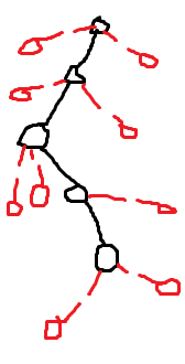 将一段连续的绿点与黑子树拿出来(如图绿色梯形部分),这一段显然也构成一棵子树,并且能知道它挂哪。因此,现在也能算出绿点对红点的贡献(当然黑点对红点的贡献最好在这里一起算)。
