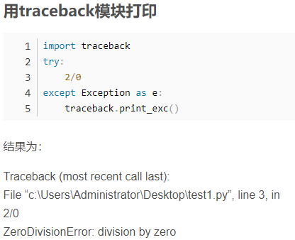 traceback.print_exc()是直接打印错误 traceback.format_exc()返回字符串,可将错误信息保存在文档日志中 可以说traceback.print_exc()等同于print traceback.format_exc()