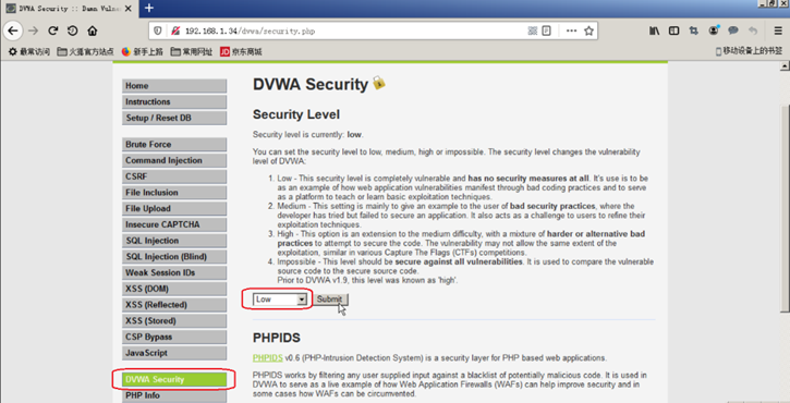 3.成功登录DVWA网站后,选择网站左侧菜单“DVWA Security”,将DVWA网站安全等级设置为“Low”。