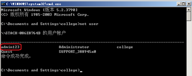 (2)在cmd下输入net user命令,会看到靶机操作系统中被添加了一个用户“admin123”。
