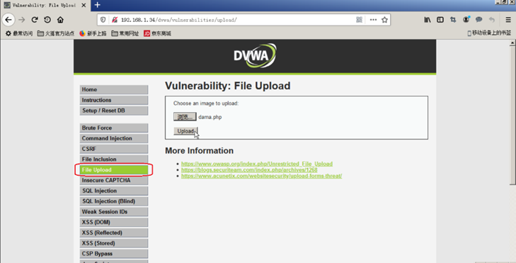 4.选择网站左侧菜单“File Upload”,将攻击机Win2008-att桌面文件夹Tools中的dama.php(实验中所用的webshell)、nullevt.mof文件上传至靶机。