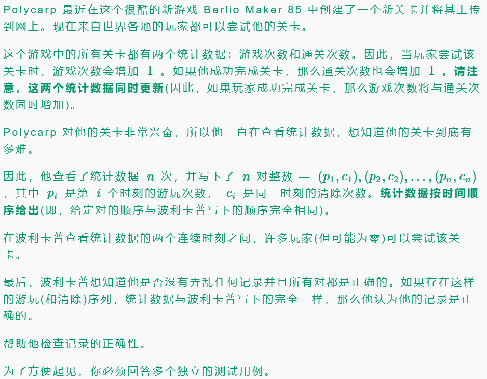 如果输入的数据游玩次数的增长小于通关次数的增长,游玩总次数随时间下降或通关总次数随时间下降,通关次数大于游玩次数。那么就输出NO,否则输出YES。