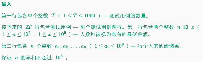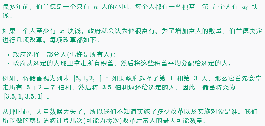 n个人要变成富人,成为富人的最低标准是拥有x元,我们可以先把现有富人多余的钱拿走,然后按金钱数从大到小的顺序分配给穷人。这样可以保证人数最多。