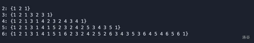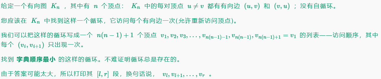 给你一个n个结点的完全图,找出最小字典序的欧拉回路遍历的结点,输出其中一段。