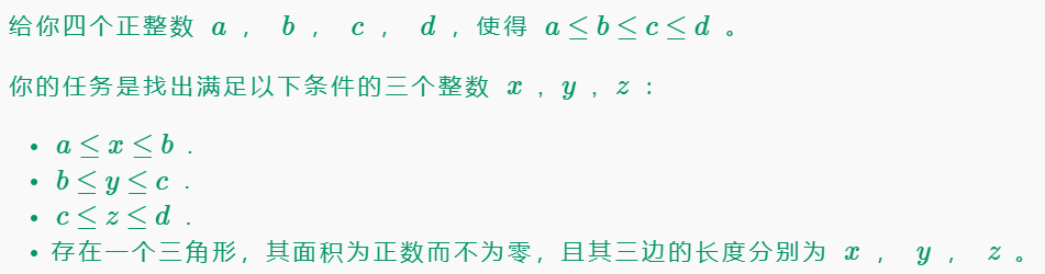 我们只要输出 b c c 就好了,因为保证可以组成三角形,这三个数是距离最近的。