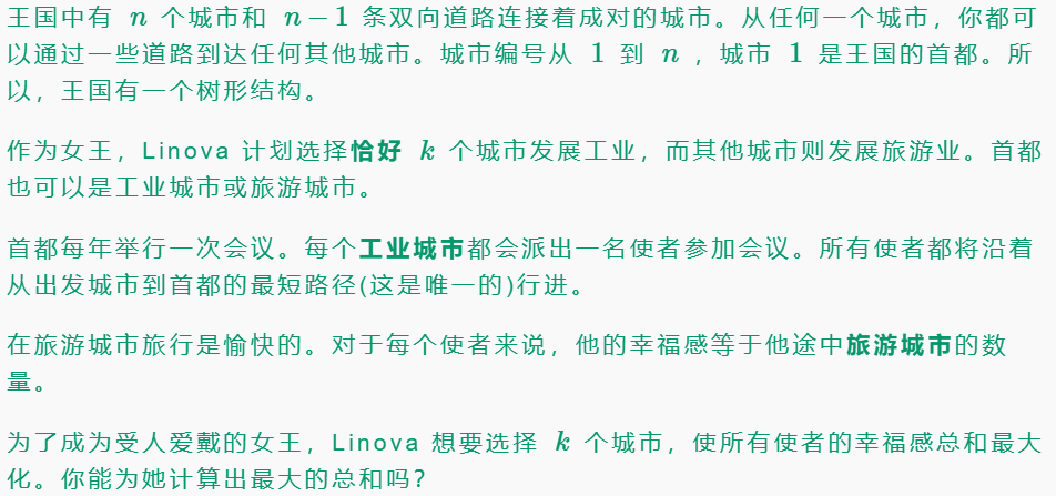 我们肯定是先选距离最远的叶子节点作为旅游城市,不过我们可能会经历一种情况,叶子节点选择完毕了,我们只能选择非叶子节点了。这样的话,非叶子节点的所有子节点都会减少经过一个旅游城市,我们首先进行dfs,记录每个节点的子树大小,然后记录这个结点出发到终点 1 的距离。对于非叶子节点,如果这个节点要走的话,我们减去他的子树大小就好了。