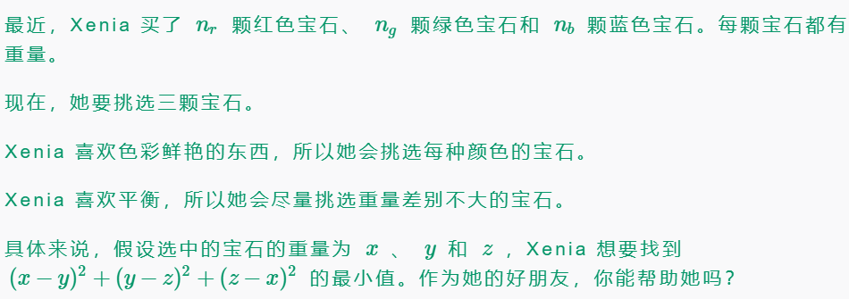 A中的一个球 x,那么 B,C 中想让答案小是不是只要试图去接近他就可以了。然后 B,C 同理。