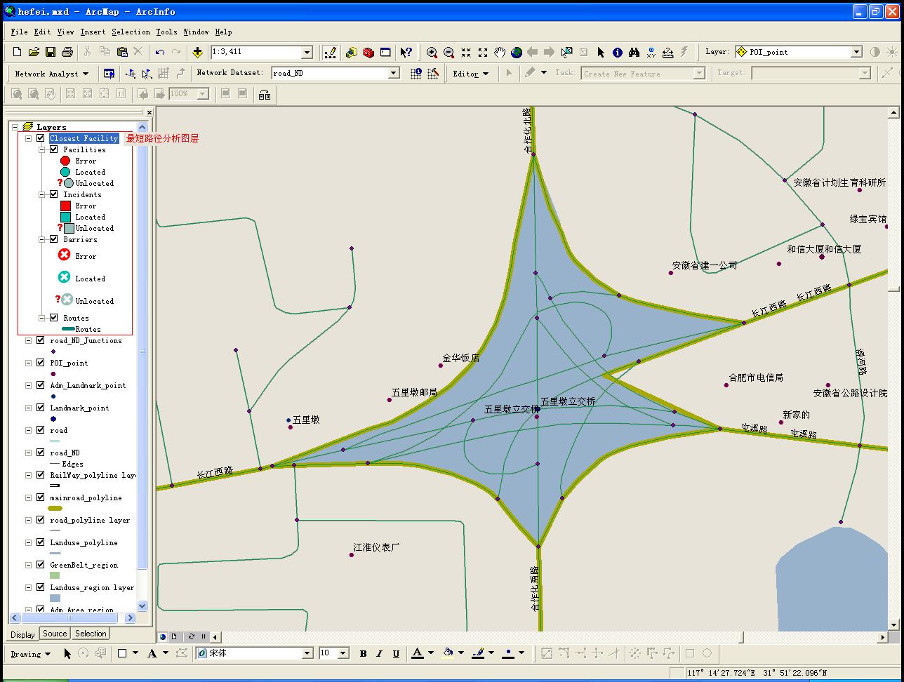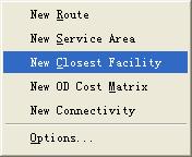 这时在工作空间里,可以看到多了一个名为“Closest Facility”的图层。它下面还有4个子图层,名字分别为“Facilities”,“Incidents”,“Barriers”,“Routes”。“Facilities”就是设施点图层,也就是目的点,“Incidents”的意思就是出发点,“Barriers”是障碍点,意思就是地图某条道路附近有一个障碍点,如果障碍点与道路距离在容限范围内,则表示此道路不通,“Routes”就是最终的结果。这样我们编程实现最短路径的思路就出现了: