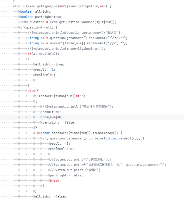 当输入为#N开头的判断为多选题,在saveanswer中新增加一个type变量,当出现多选题时,将type置为2,便于后续判断,然后再看判断是否正确部分: