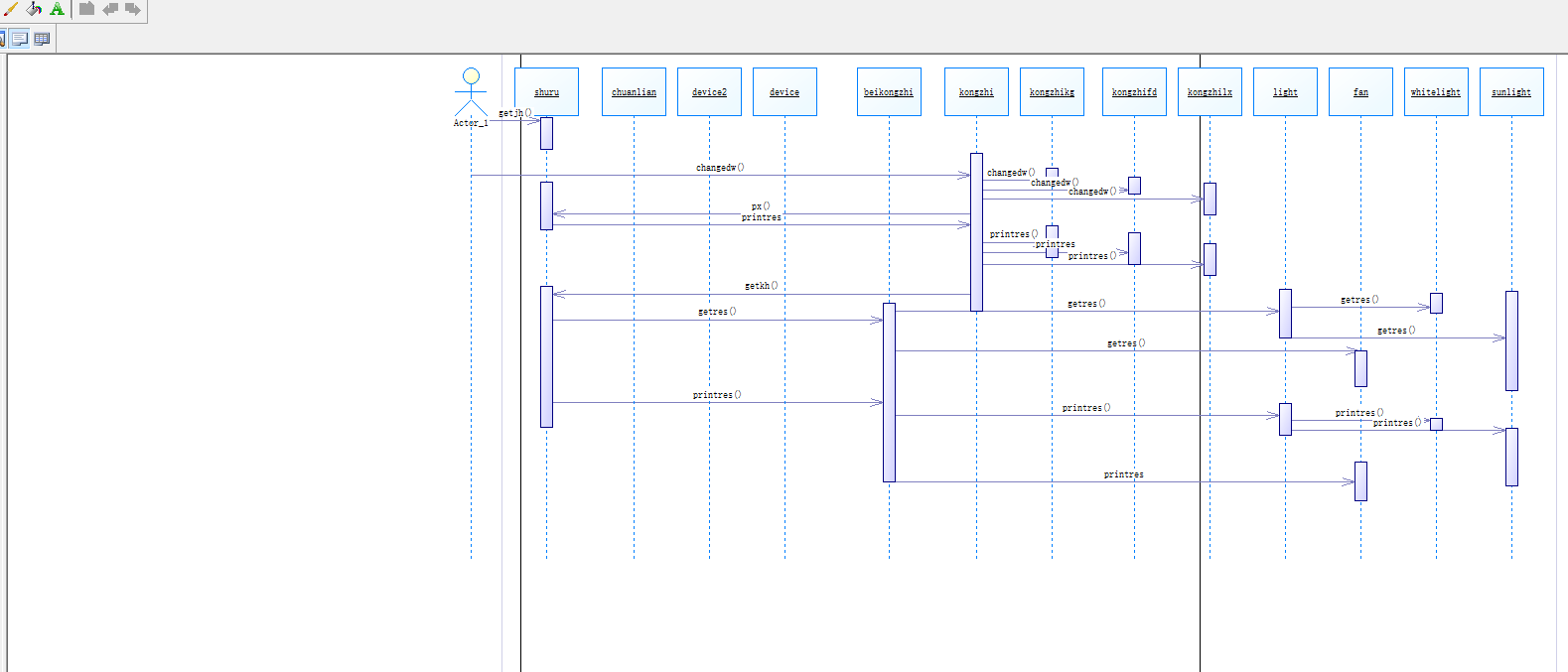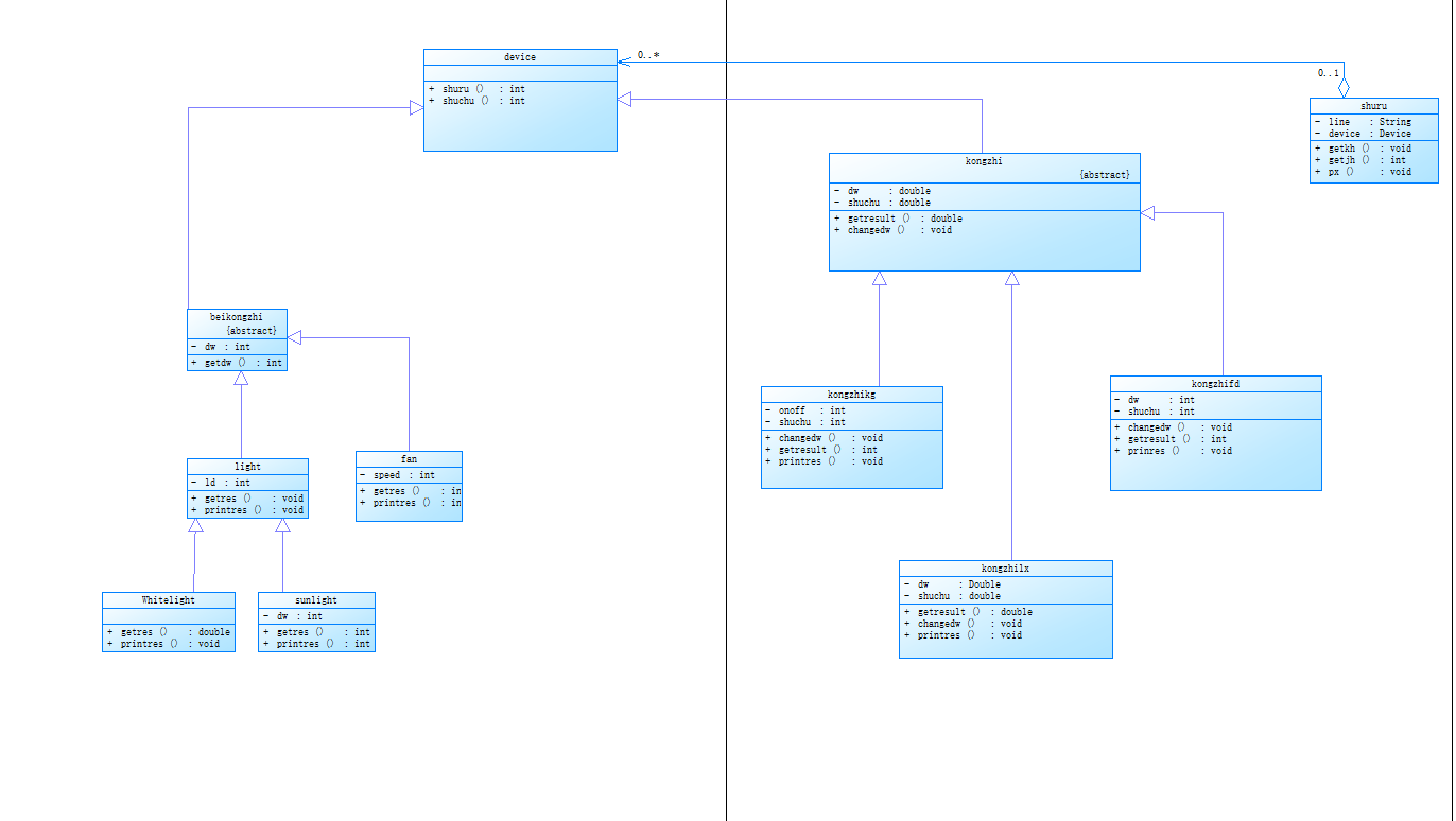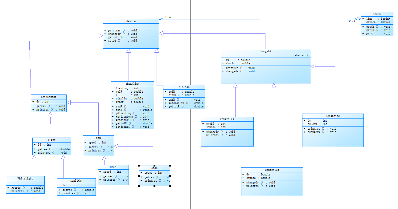 类图分析,在这一次大作业当中,我定义了一个device总的父类,然后我定义了一个类shuru,用来处理输入的状态,比如在第一种情况输入时(即输入电路时),我在输入中创建不同电器的类并且完成其的初始化。然后在输入第二种情况(即控制原件状态的时候),在shuru类中分解并传到device类中。我定义了一个子类beikongzhi,这个子类里面有一个dw变量和一个getres方法,这个dw变量是用来存储电流经过后该电器的状态的,二这个getres方法是将该电子原件的状态输出的方法。然后这个beikongzhi的子类同时还是一个light和fan类的父类,因为题目中的电器主要是灯和风扇,因此我将灯和风扇作为父类,以便于后续处理其他灯类型和风扇类型的变量。这个light和fan都是继承与beikongzhi的父类,因此里面都有一个printres的方法,同时我还增加了一个共同的getres方法,因为在打印之前需要获取最终的要打印的值,而这个getres方法就是用来获取最终要打印的值的方法。在light子类的情况下,他同时又作为Sunlight类和White类的父类,这两个子类一个作为日光灯,一个作为白炽灯,同样继承了light中的getres和printres的方法。