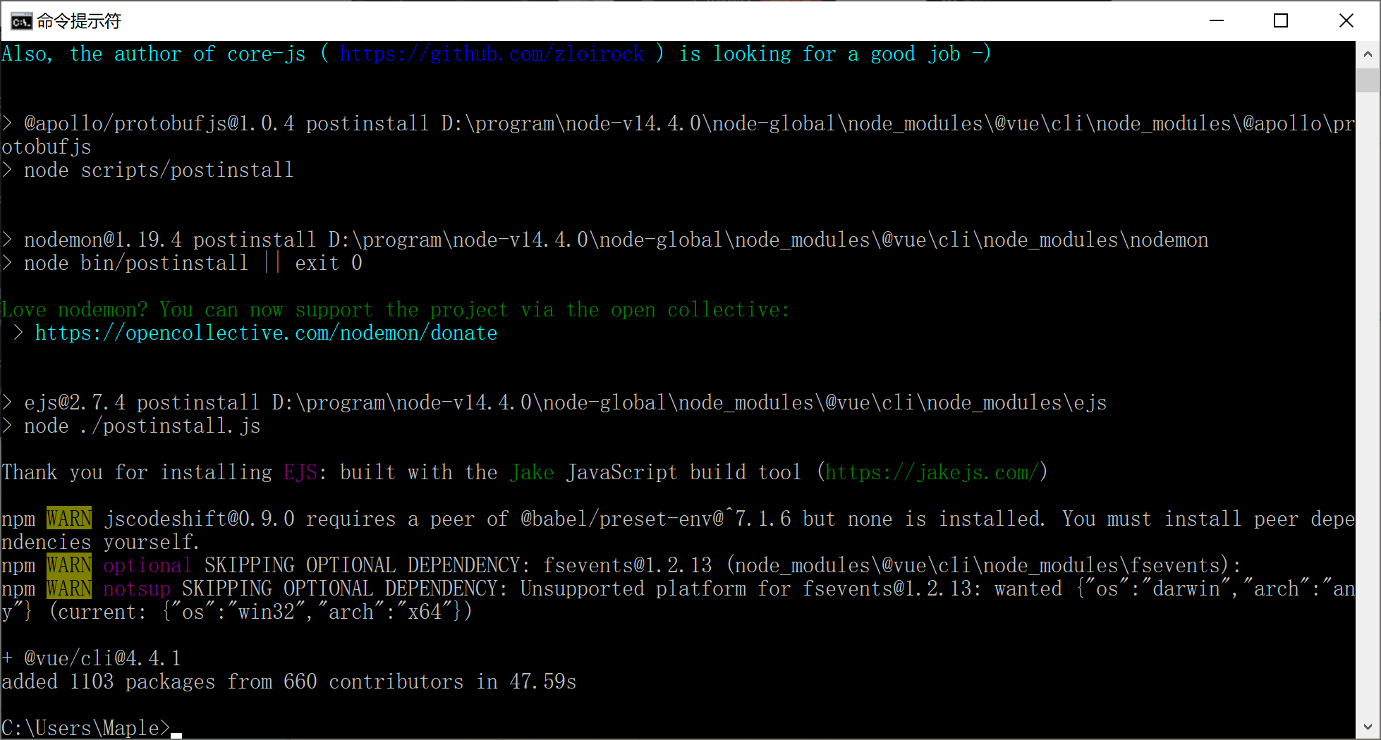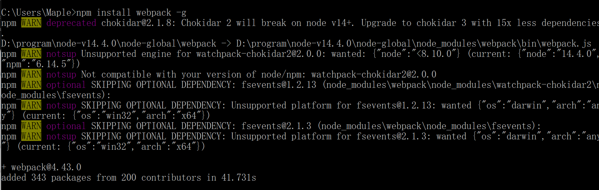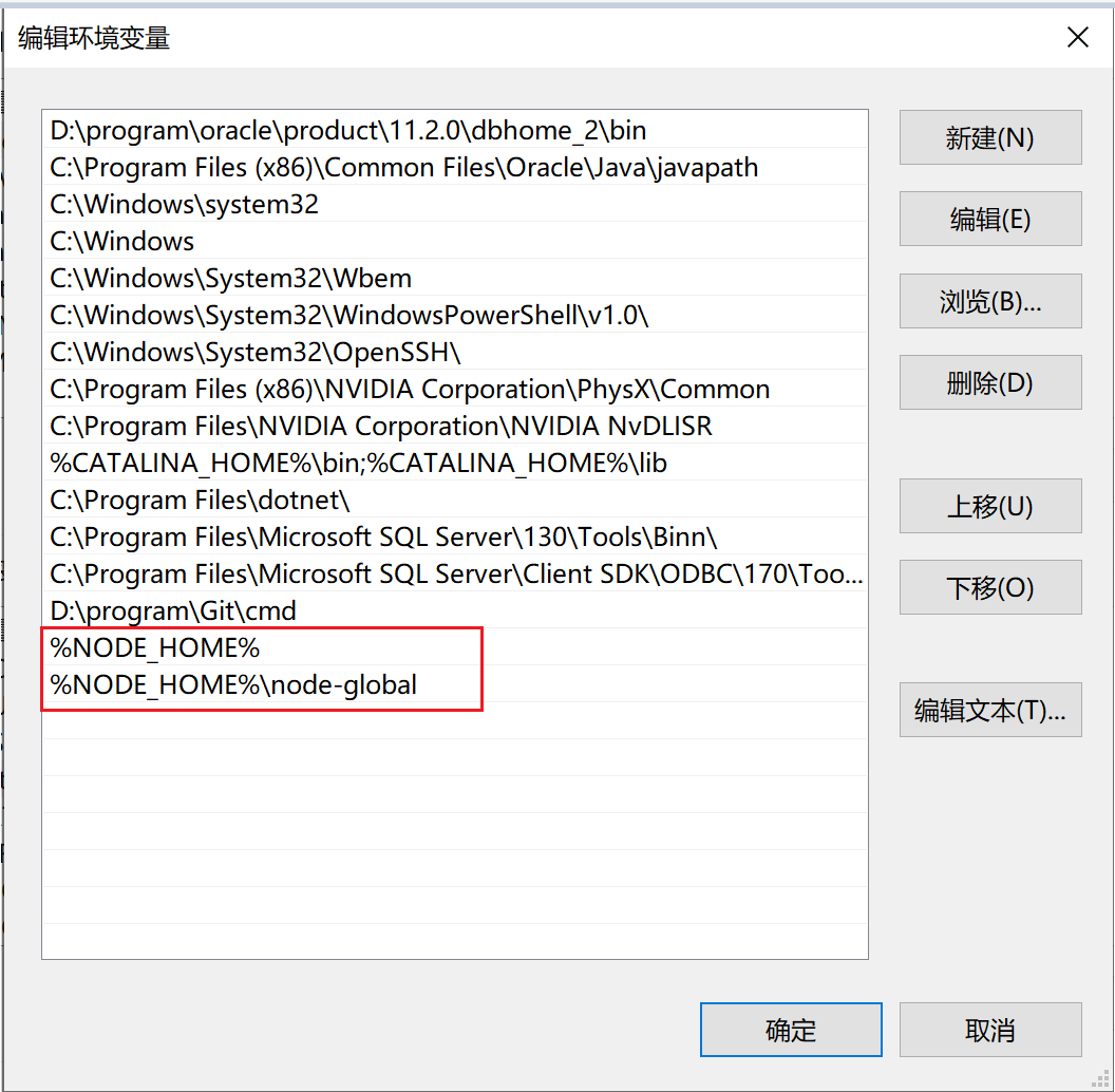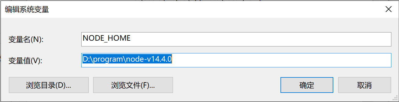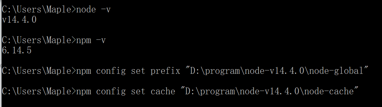 控制台输入: node -v npm -v 通过命令配置两个自己建立的路径: npm config set prefix "D:\program\node-v14.4.0\node-global" npm config set cache "D:\program\node-v14.4.0\node-cache"