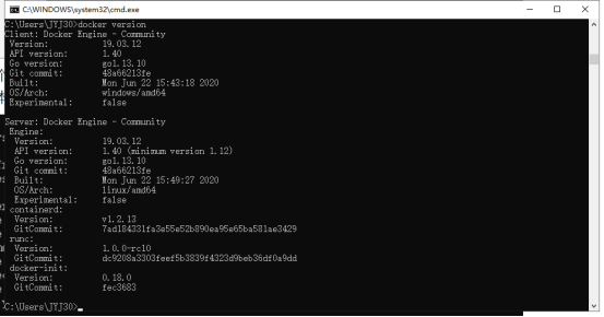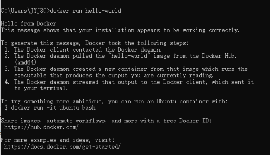 进入到本机的终端(就是CMD,但是需要用管理员的身份来运行),输入:docker version/docker run hello-world,分别出现以下画面,则代表docker运行正常!
