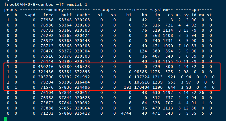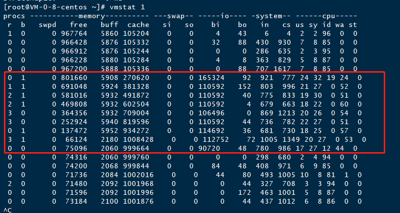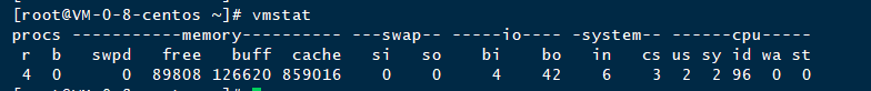 1、首先再一个终端上运行vmstat命令