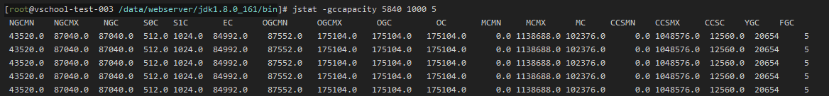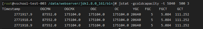 jstat -gcoldcapacity -t 5856 500 3 #pid 5856的java进程的年老代行为统计,-t是显示时间戳,后面是500毫秒为时间间隔打印3次
