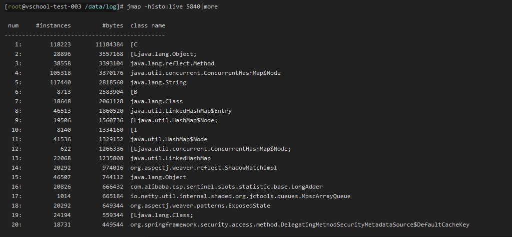 -histo[:live] #显示堆中对象的统计信息。打印堆的直方图。对于每个Java类,将打印对象的数量,以字节为单位的内存大小以及完全限定的类名称。JVM内部类名称以星号(*)前缀打印。如果指定了活动子选项,则只对活动对象进行计数。