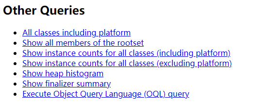 jhat还提供了一种对象查询语言(Object Query Language),OQL有点类似SQL,可以用来查询。OQL语句的执行页面: http://localhost:7000/oql/。OQL帮助信息页面为: http://localhost:7000/oqlhelp/