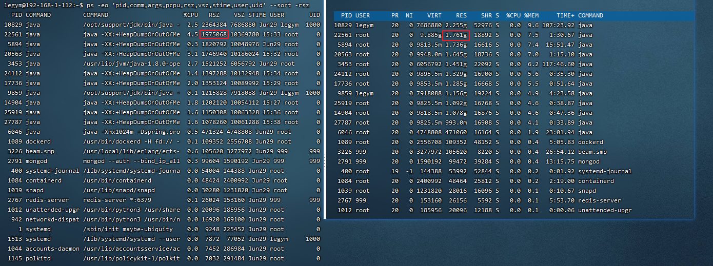 rsz与RES对比:都是占用了1.7G的物理内存