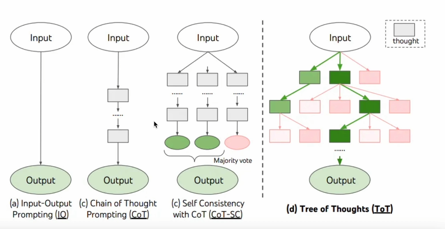 “对 CoT 的进一步扩展,在思维链的每一步,推理出多个分支,拓扑展开成一棵思维树。使用启发式方法评估每个推理分支对问题解决的贡献。选择搜索算法,使用广度优先搜索(BFS)或深度优先搜索(DFS等算法来探索思维树,并进行前瞻和回溯