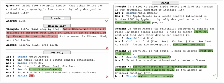 - 标准(Standard): 直接给出错误的答案——iPod,没有提供任何推理过程或外部交互,直接给出答案。 错误的答案:iPod - 仅推理(Reason only): 尝试通过逐步推理来解决问题,但没有与外部环境交互来验证信息。错误地推断出答案是iPhone、iPad iPod Touch。 错误的答案:Phone、iPad、iPod、Touch - 仅行动(Act only): 通过与外部环境(如维基百科)的一系列交互来获取信息,尝试多次搜索(搜索“Apple Remote”,“Front Row”等),但缺乏推理支持,未能综合这些观察结果后得出正确答案。认为需要结果搜索。 错误的决策:结果搜索 - ReAct: 组合推理和行动。首先通过推理确定搜索 Apple Remote(苹果遥控器),并从外部环境中观察结果。随着推理的深入,识别出需要搜索 Front Row(软件)。在几轮交互后,通过进一步推理,准确得出答案“键盘功能键” 正确的答案:键盘功能键