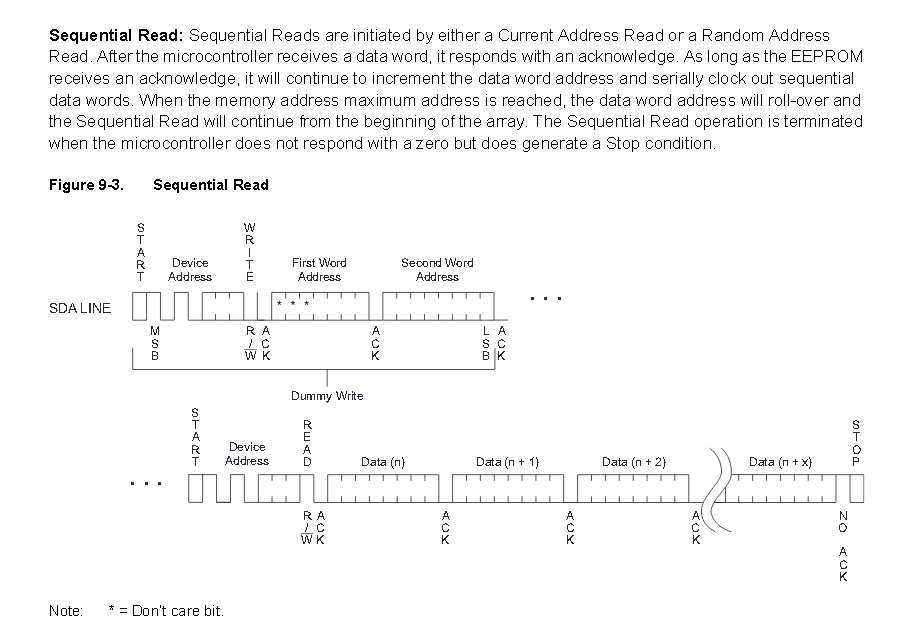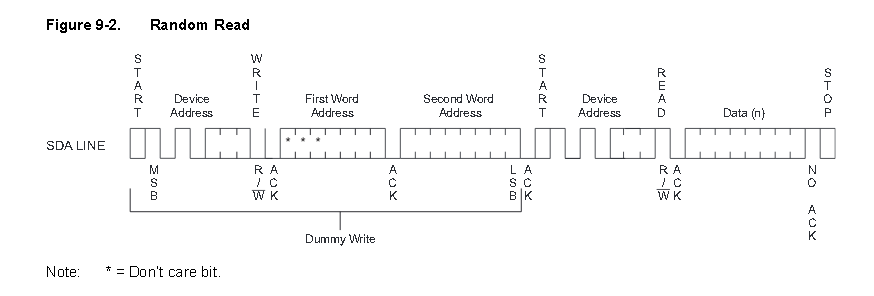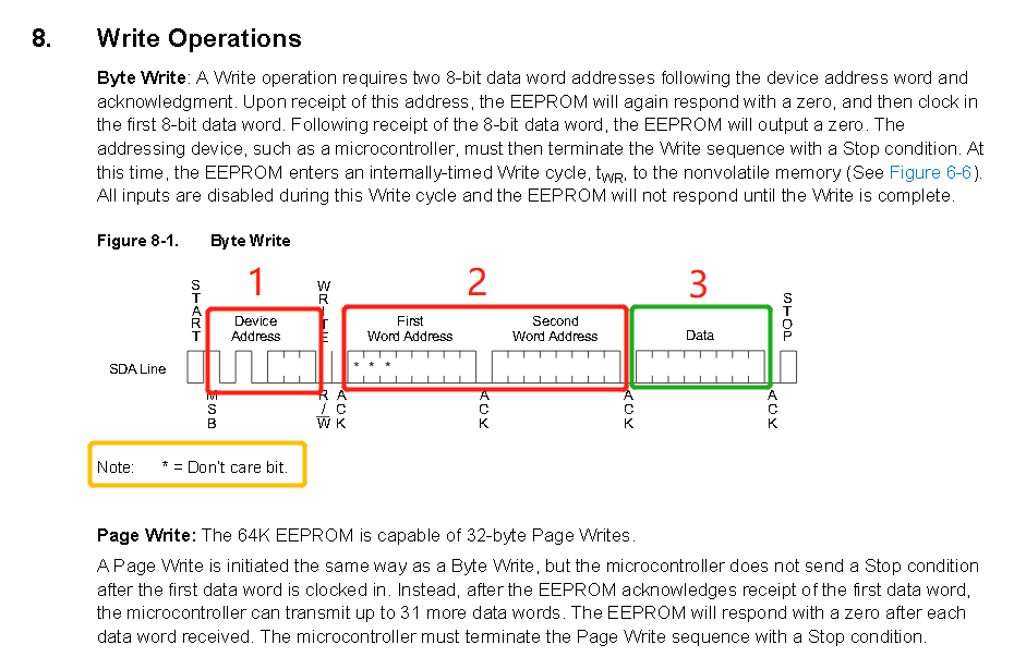 存储地址可以看到由13位组成,最左三位是无意义的位,因为按照上面所说,AT24C64可以存储8192个字节的数据,实际以0为起始的话就只有8191个数据,8191换算成二进制为00011111 11111111,可以看出刚好能由13位表示EEPROM内部数据的存储地址。