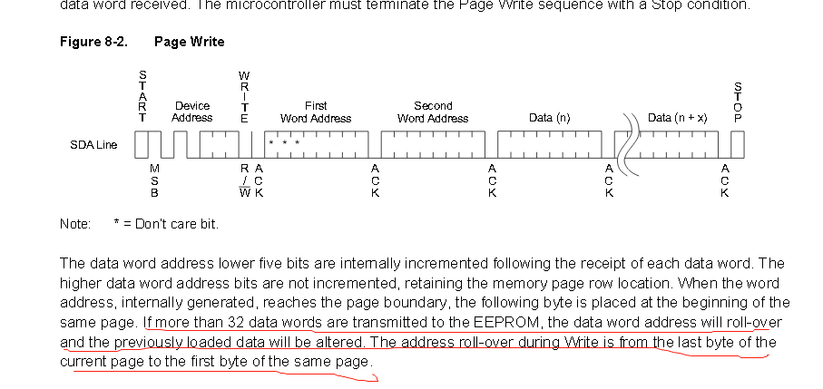 上图还可以知道AT24C64每页存放32个字节,那么就有8192/32 = 256页,页写入的时序如下图所示。