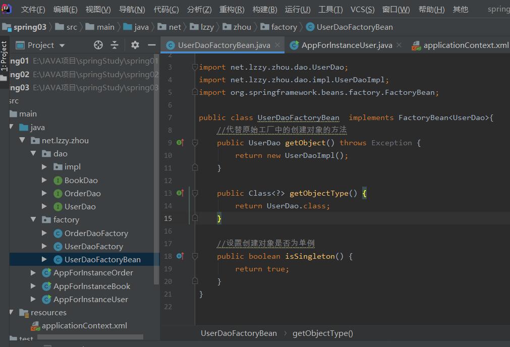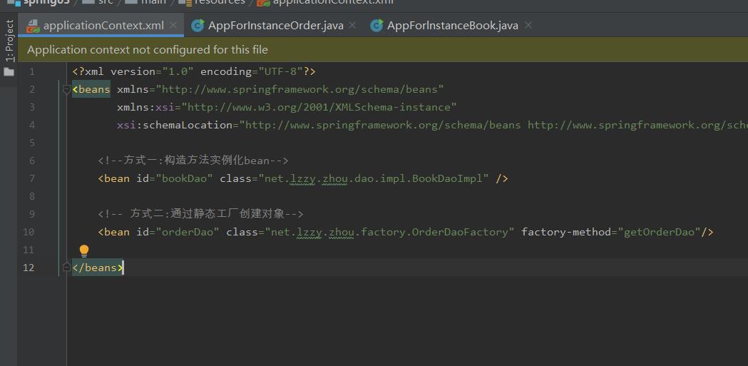 在bean中class指向静态工厂类,通过使用 factory-method="getOrderDao"指定使用工厂的方法new对象