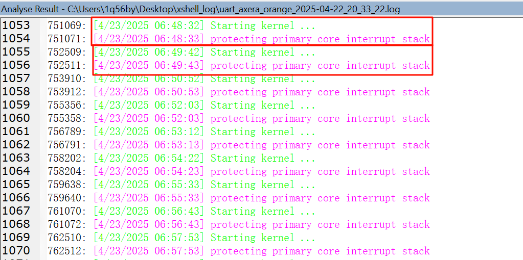 1.有如下log, Starting kernel ...和 protecting primary core interrupt stack 成对出现,想统计成对出现的次数。