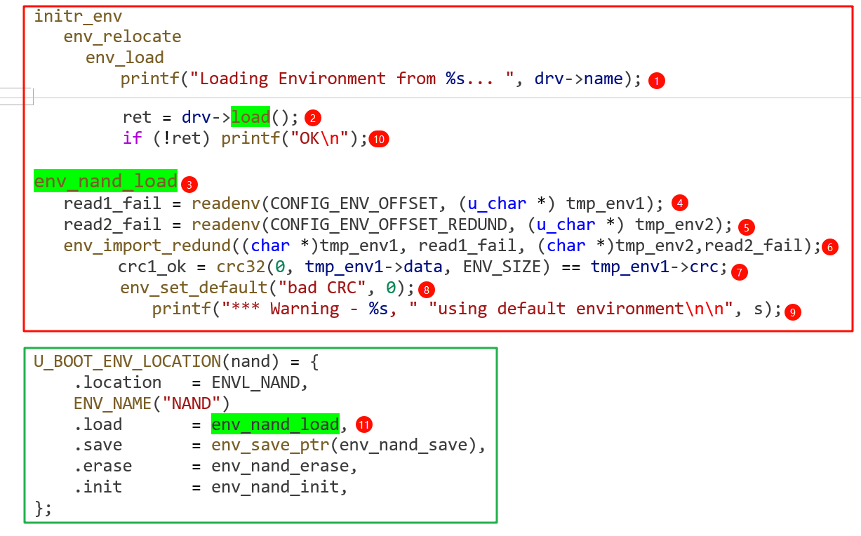 3.2 调用函数指针drv->load(),这个值被填充的地方是在下图绿框里面结构定义,值为圆圈3,env_nand_load