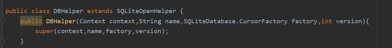 接下来需要写一个带全部参数的DBHelper类的构造函数,以后生成数据库对象的时候要用到: