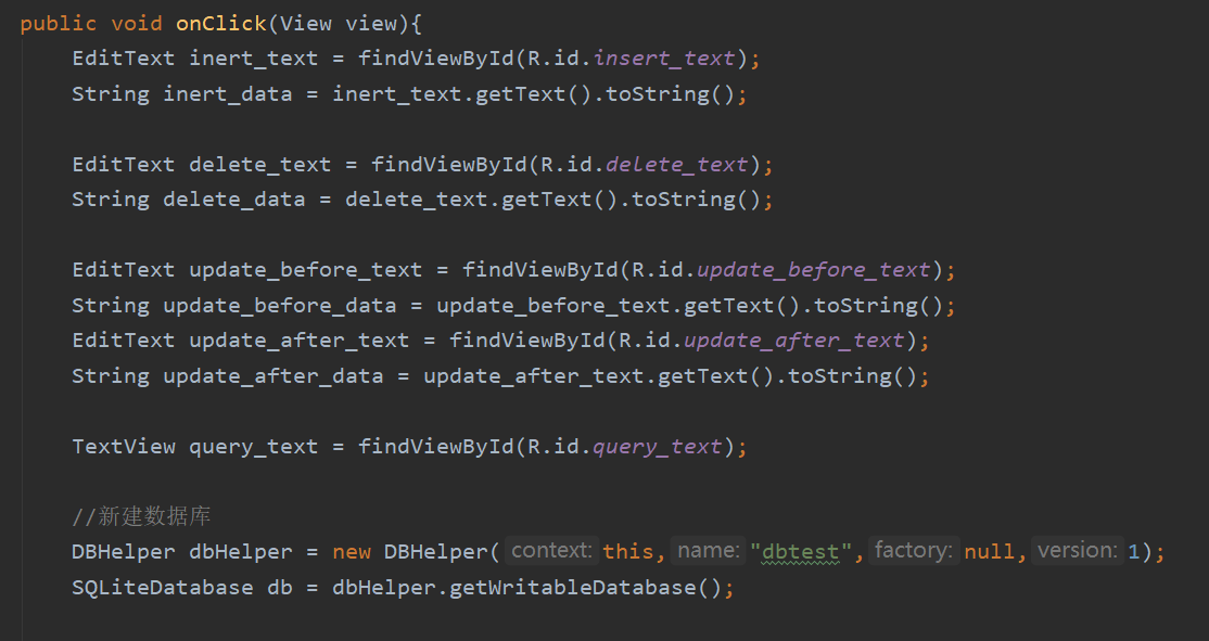 2.创建数据库,这里我们给数据库起名为“dbtest”,数据库版本号为1,代码如下: