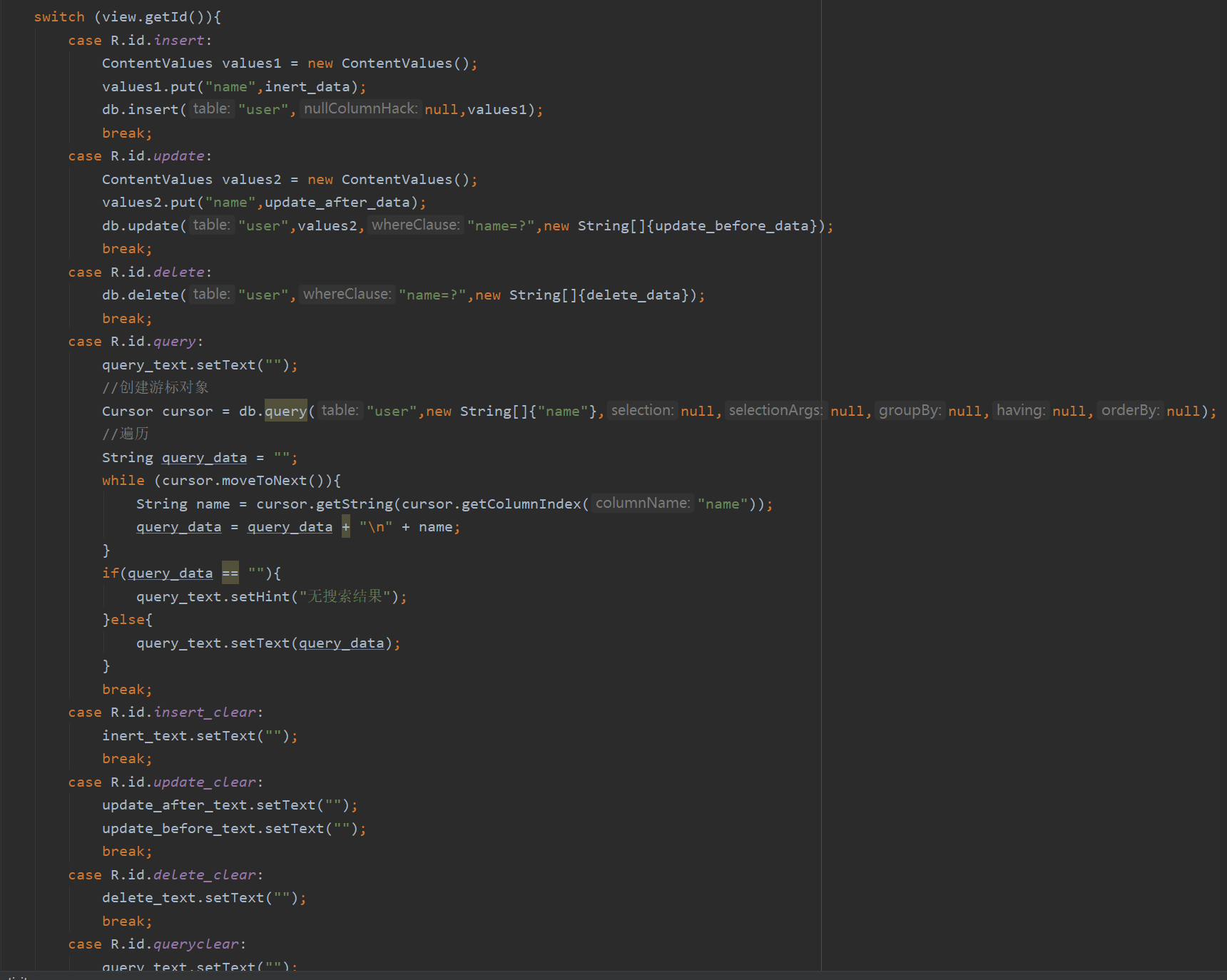 ④查:查询全部数据,这里使用了Cursor游标进行查询,游历数据同时,把数据用换行符\n连接起来,再把所有数据展示到文本显示框内,代码如下: