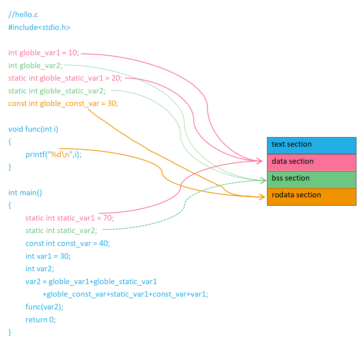 | rodata | 全局常量、字符串常量 |
