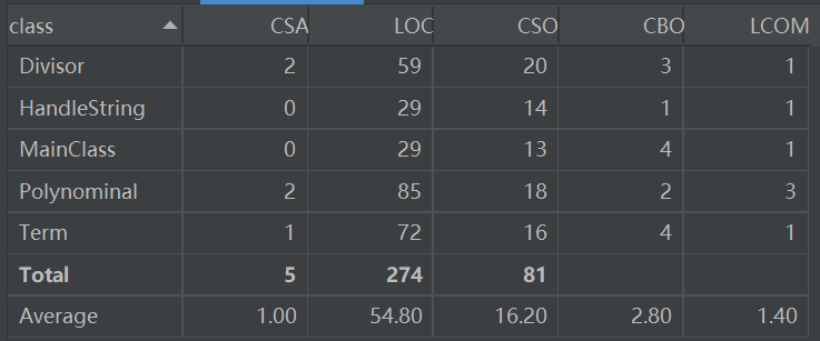 可以看到MainClass和Term类与其他类耦合度较高,Polynominal类内聚度缺乏程度较高。但总体来说,基本符合高内聚、低耦合的原则。