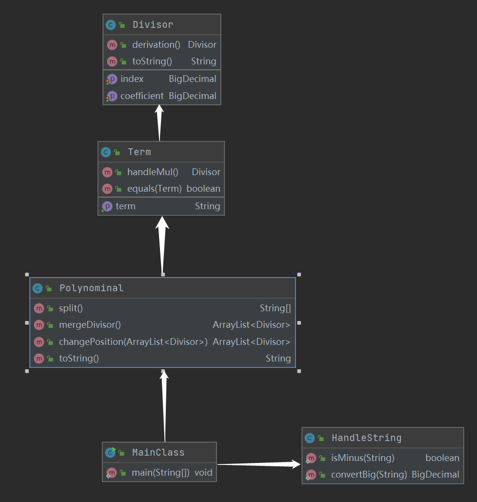- 分为五个类,Mainclass为主类,负责控制程序整体过程,HandleString为处理字符串类,负责对输入的字符串进行处理,Polynominal为表达式类,负责分隔项等与表达式相关的操作,Term为项类,主要负责处理项内部的乘法,进行化简,Divisor为因子类,包括系数和指数两大属性。
