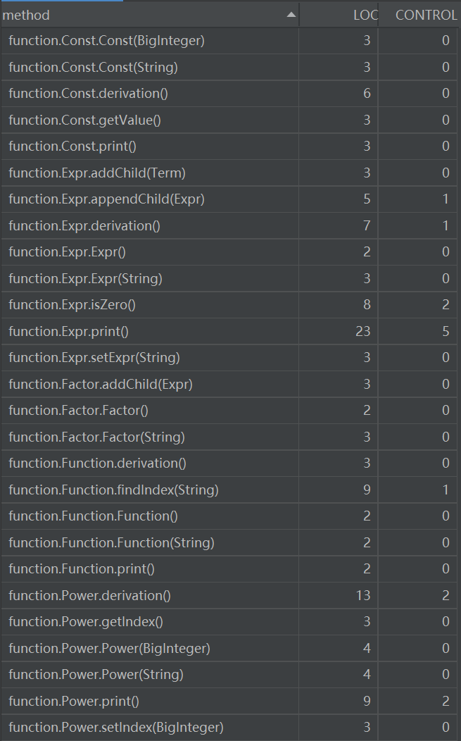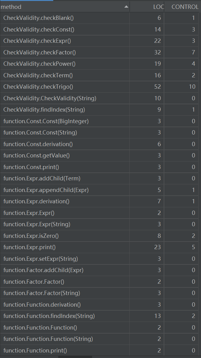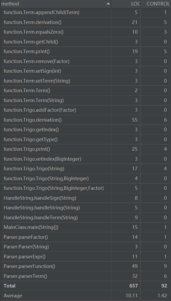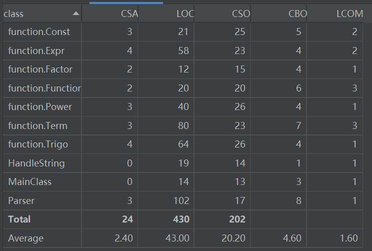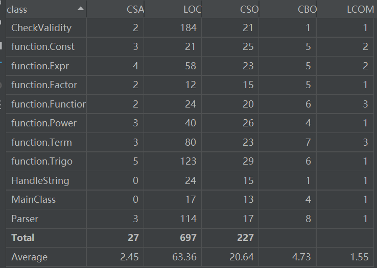 可以看到,Parser类、Funtion类、Term类与其他类耦合度较高,具体原因初步猜测为需要在Parser类中建立表达式树,三个类继承于Funtion类,而Term类向上联系表达式、向下联系因子。内聚度都较为良好。