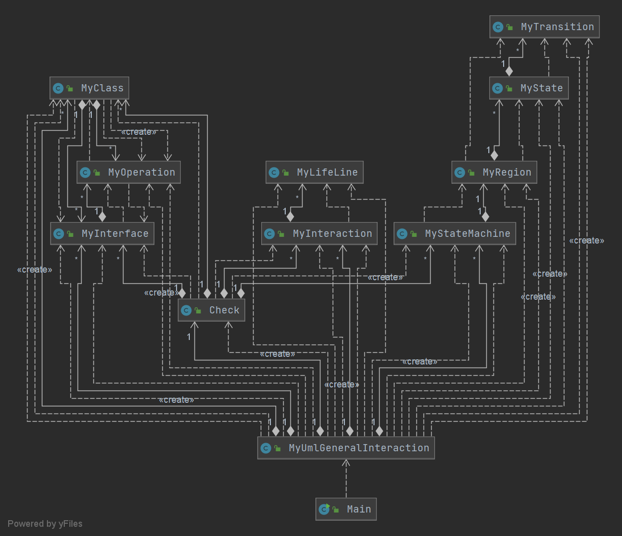 - 完全在第一次作业的基础上实现,加入了与状态图和顺序图相关的类,实现思路与第一次基本相同,重点是理解状态图和顺序图之间的元素层次关系。