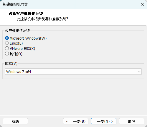 选择客户端操作系统的版本,就是虚拟机里面安装的操作系统的版本,可以点击Microsoft Windows,在版本中下拉选择Win7 X64,即64位Win7。