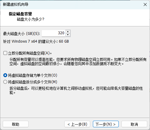 指定磁盘空间大小,320G吧,越大越好。这个磁盘容量可以超过真实机磁盘的容量,不过没啥用。能存多少文件还要看真实机的硬盘大小。