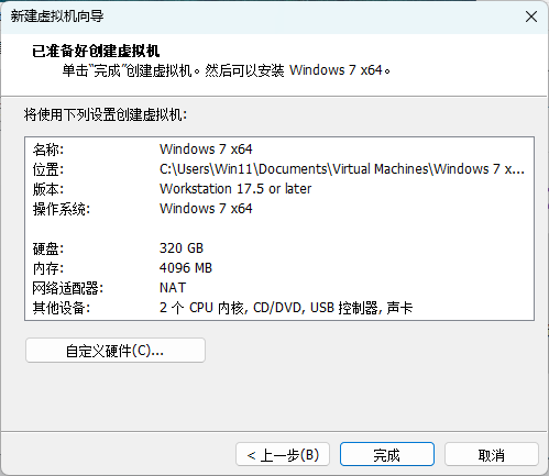 虚拟机所有的硬件都已设置完毕,点击完成结束向导。