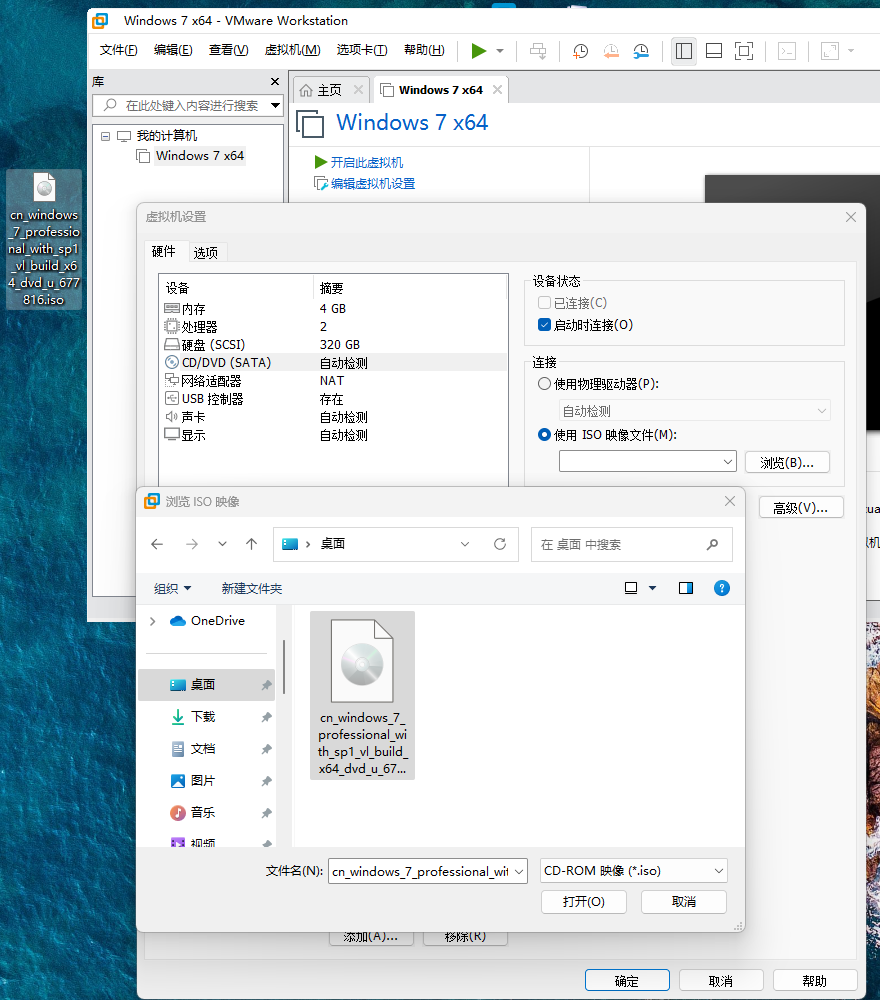 点击“编辑虚拟机设置”,在“CD/DVD(SATA)”中选择使用ISO映像文件,点击浏览选择Windows7的ISO镜像文件,勾选“启动时连接”,点击确定完成设置。