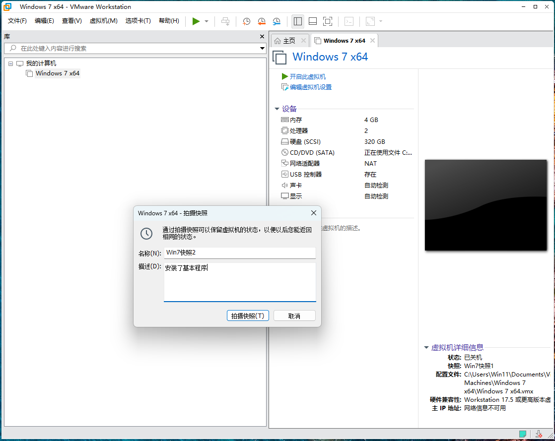拍摄快照:在需要做快照的虚拟机上点击右键,选择“快照-拍摄快照”,给快照起个名字,做个简单的备注。